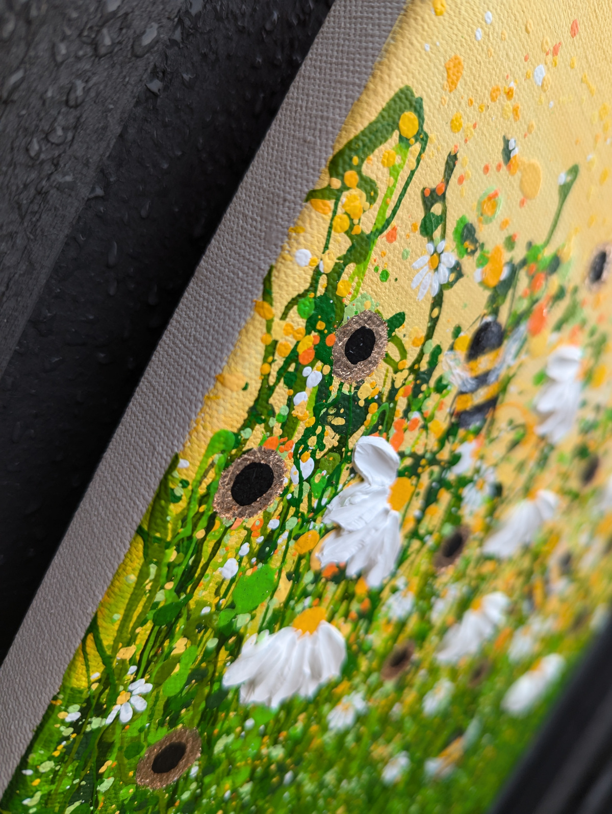 This piece is a celebration of nature’s simple delights. In it, bees buzz energetically among wild white daisies under a sunny sky.