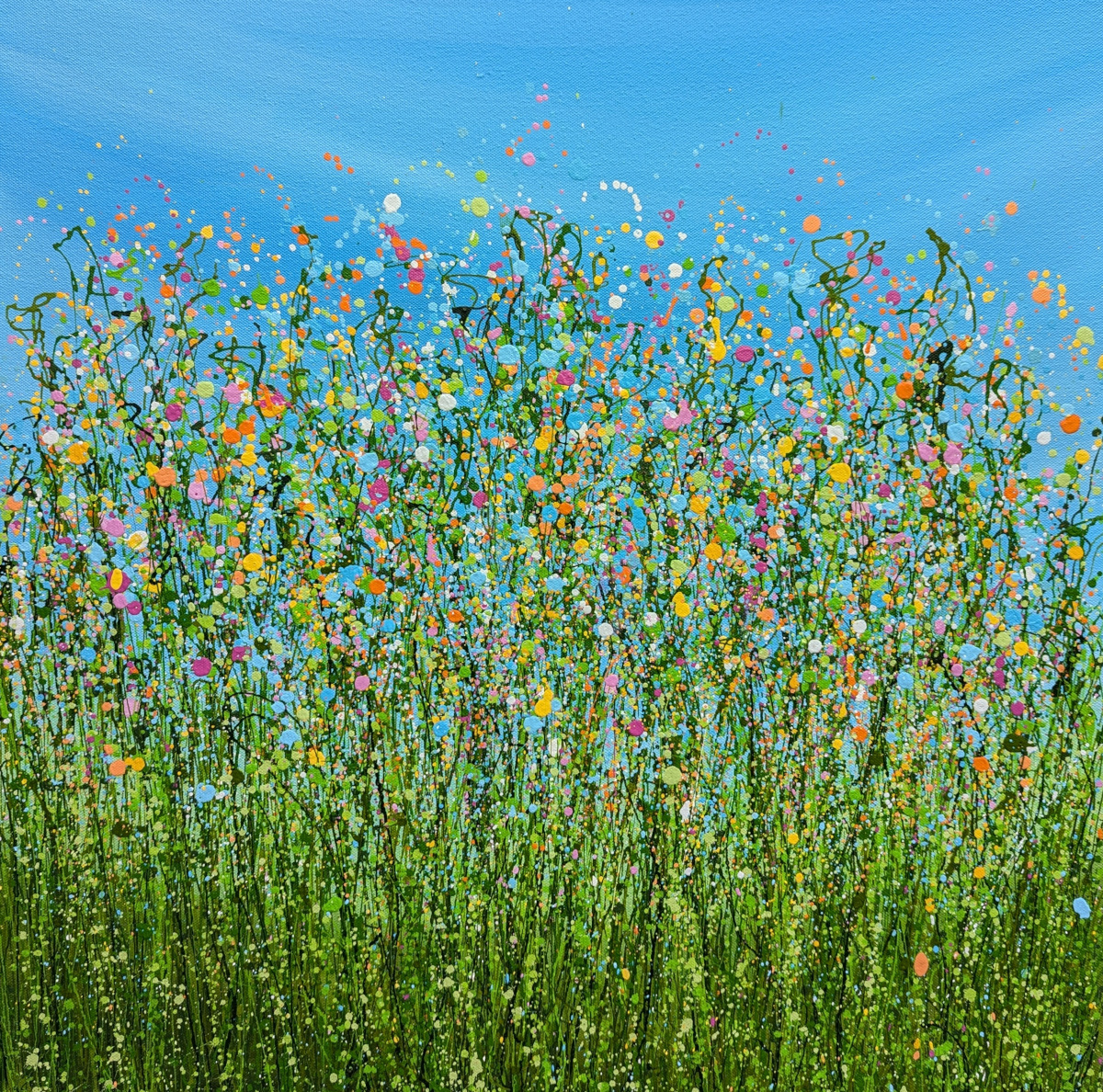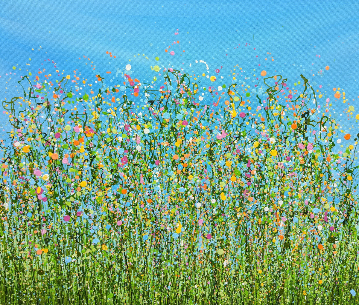 This painting is a vibrant celebration of nature’s spontaneity and beauty, depicted through energetic splashes of color and dynamic, abstract forms